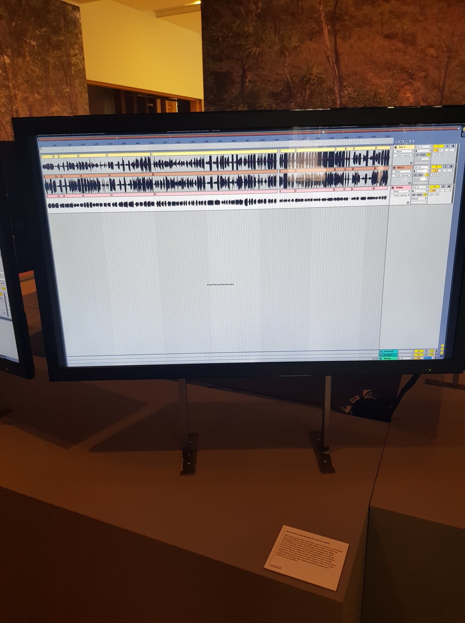 The next two screens I saw, featured what appeared to be sound waves on an editing program(fig.3). Upon reading the description, it became evident that it references how The Mulka Project has been archiving songs from thirteen clans to ensure that they aren’t forgotten in the future. According to the description, since 2015, the music studio has also allowed songwriters and musicians to work with Yolŋu sound engineers to create new styles of music that incorporate their traditional songs. This links to the AIDC:CD protocol number one point : “Indigenous led. Ensure Indigenous representation  creation in design practice is Indigenous led.”(AIDC:CD, 2016) This is an important point because it makes sure that Indigenous people are at the forefront of the practice and have a big say in how much their traditional song is transformed with the newer modern techniques. I think it’s great because the Indigenous people are the only ones that will know where to draw the line when it comes to how much their traditional song can be altered before it becomes too much.