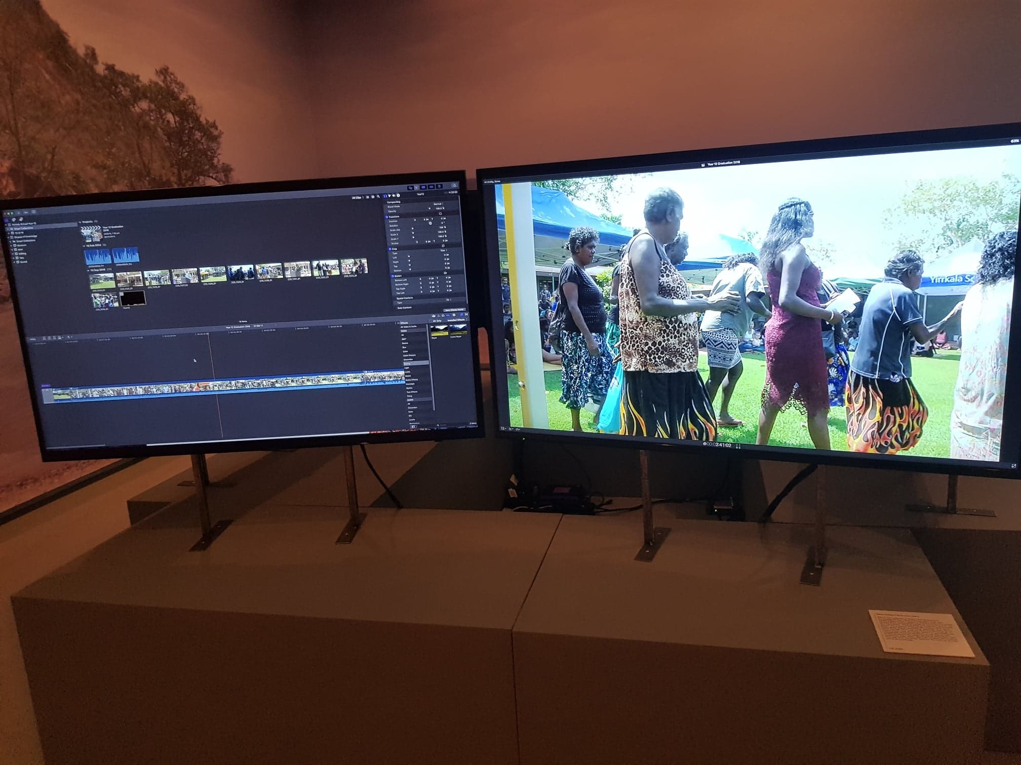 The first two screens I saw showed a video being played of a ceremony, next to another screen showing a screenshot of the videos in an editing program (fig.2). This signified the video making aspect of the project. Every year, Yolŋu filmmakers create over 100 new films which feature events such as bapurru ceremonies and films in the presence of senior law holders, as well as different aspects of their culture in general such as their food, art and dance. Importantly, there are films in the collection that have never been seen because they are waiting for senior elders to approve the films and allow them to go public with them.