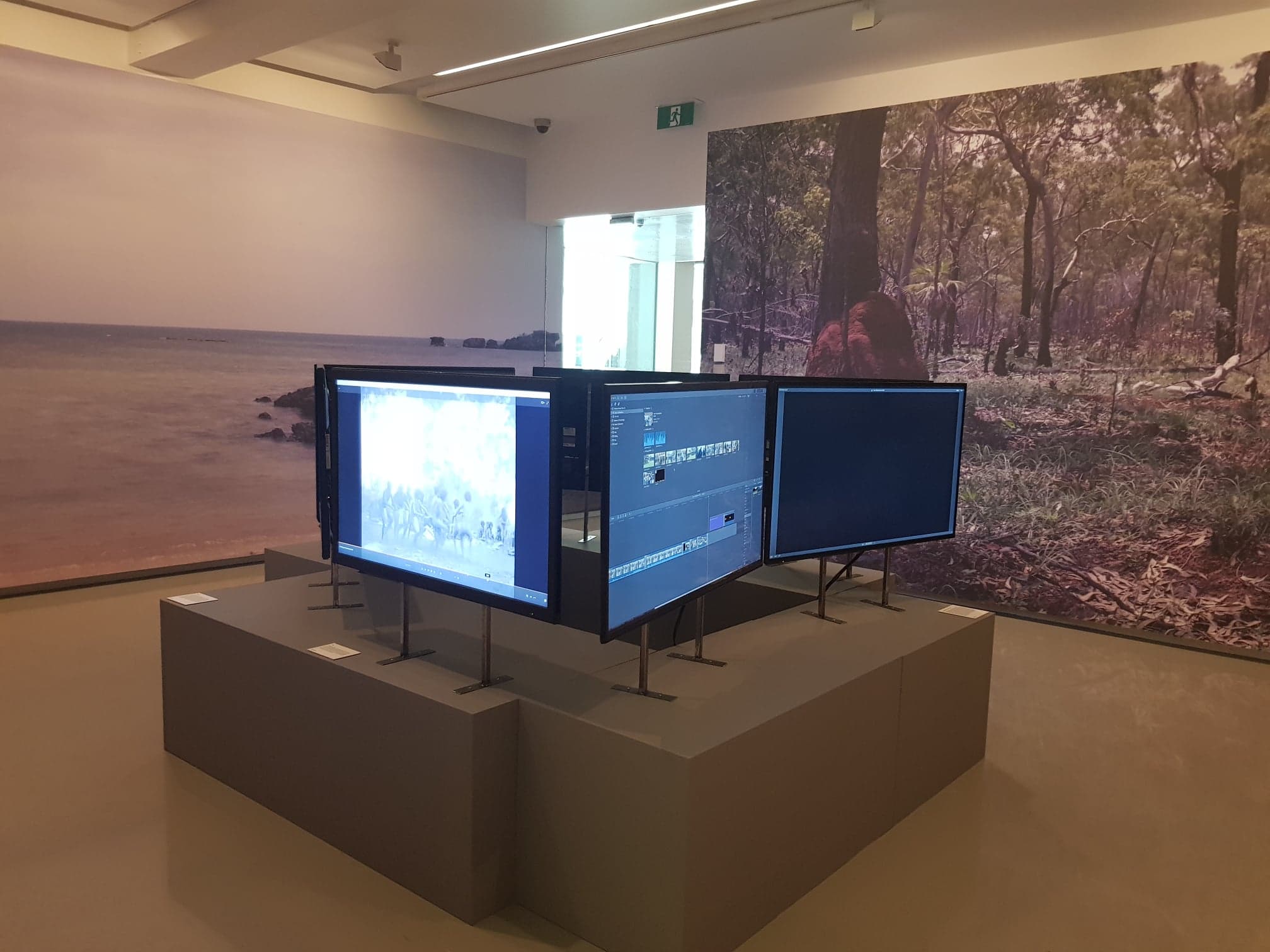 Upon entering the exhibition, the audience finds themselves in a room with an abundance of visual stimuli. All four walls are covered from top to bottom with a large print of a natural landscape that allow you to feel almost as if you’re in the middle of yolŋu country. Two of which depict a forest area, laden with green trees and grass, and a red dirt pathway in the centre. The other two walls portray a different landscape, this one being an ocean view, with soft gradient blues of the water which extend onto a collection of black rocks and then extend onto another area of greenery. In the centre of the room stands a display of seven screens all in a circle facing outwards and standing on a grey platform(fig.1). The displays all show different visuals such as video, video editing stills and sound editing programs, that the audience find out are part of ‘The Mulka Project’.