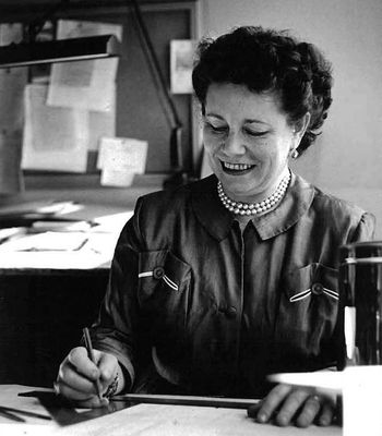 This portrait of Kogan in 1955 shows a powerful and focused designer at apex of her craft. She is pictured using tools that no doubt for the time would have been considered objects solely for the hands of men, like slide rules and protractors, to create complex sketches and drawings. The contented and focused smile that sits on her face perhaps demonstrates the ease with which she plays across plays the craft which she is so excellent in.