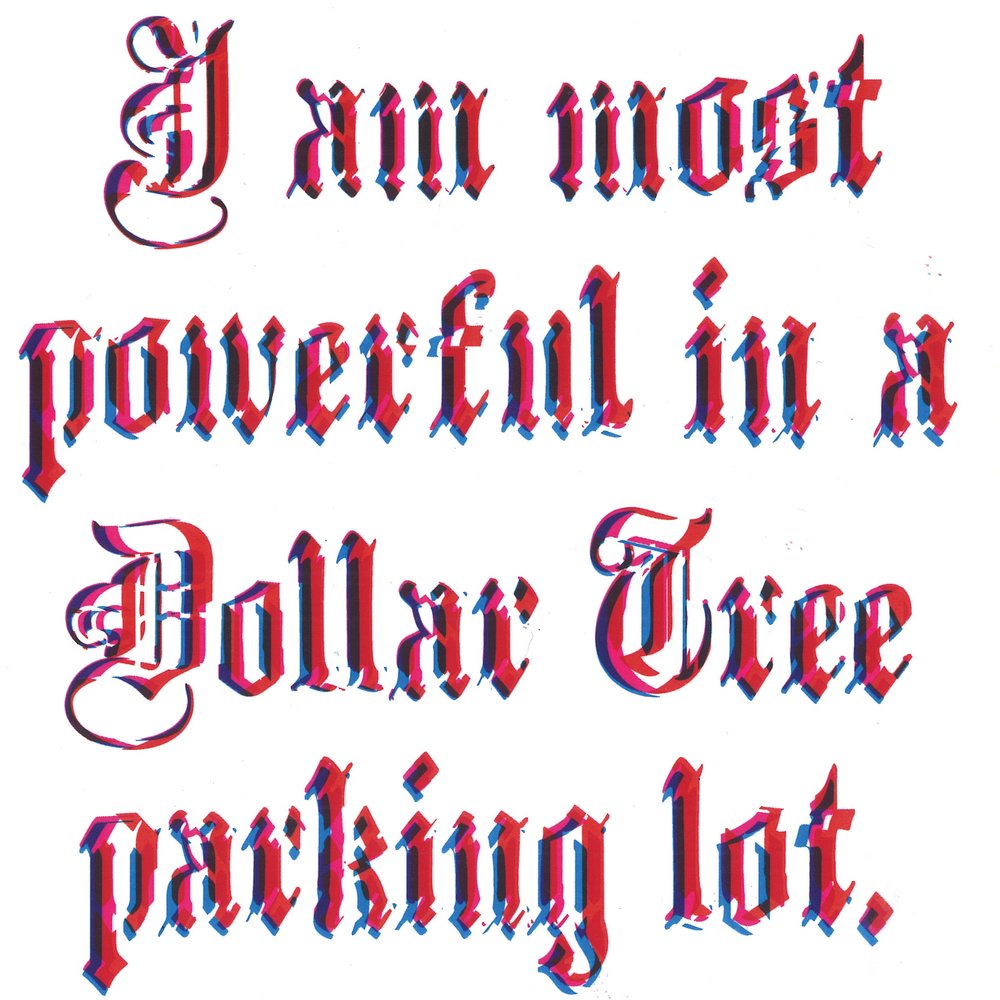 Another work of Critchlows stood out to me as I was browsing her website, Dollar Tree (see figure 4) a series of three typographic prints (Critchlow 2019). The prints read “I am most powerful in a Dollar Tree parking lot” in three different colour combinations (Critchlow 2019). The words speak of a lower class experience, standing outside a dollar store. This is a relatable experience to many people, they have been to dollars stores before, there is no luxury or exclusivity to speak of and yet she elevates the dollar store. She describes the experience as imbuing her with power (Critchlow 2019). What I connected with in this work is the type face itself. It is a Olde English style type, one which I would say falls under the umbrella of “bad taste”. It is tacky and cartoonish, and yet its historical connotation lend weight and religiosity to her words. The character of the typeface is what in turn imbues the content with power. Why do we consider it a poor taste typeface if it serves its function and adds to the design? I do not believe a simplified type that would be considered “fresh” and following modern notions of aesthetics would have had the same impact.