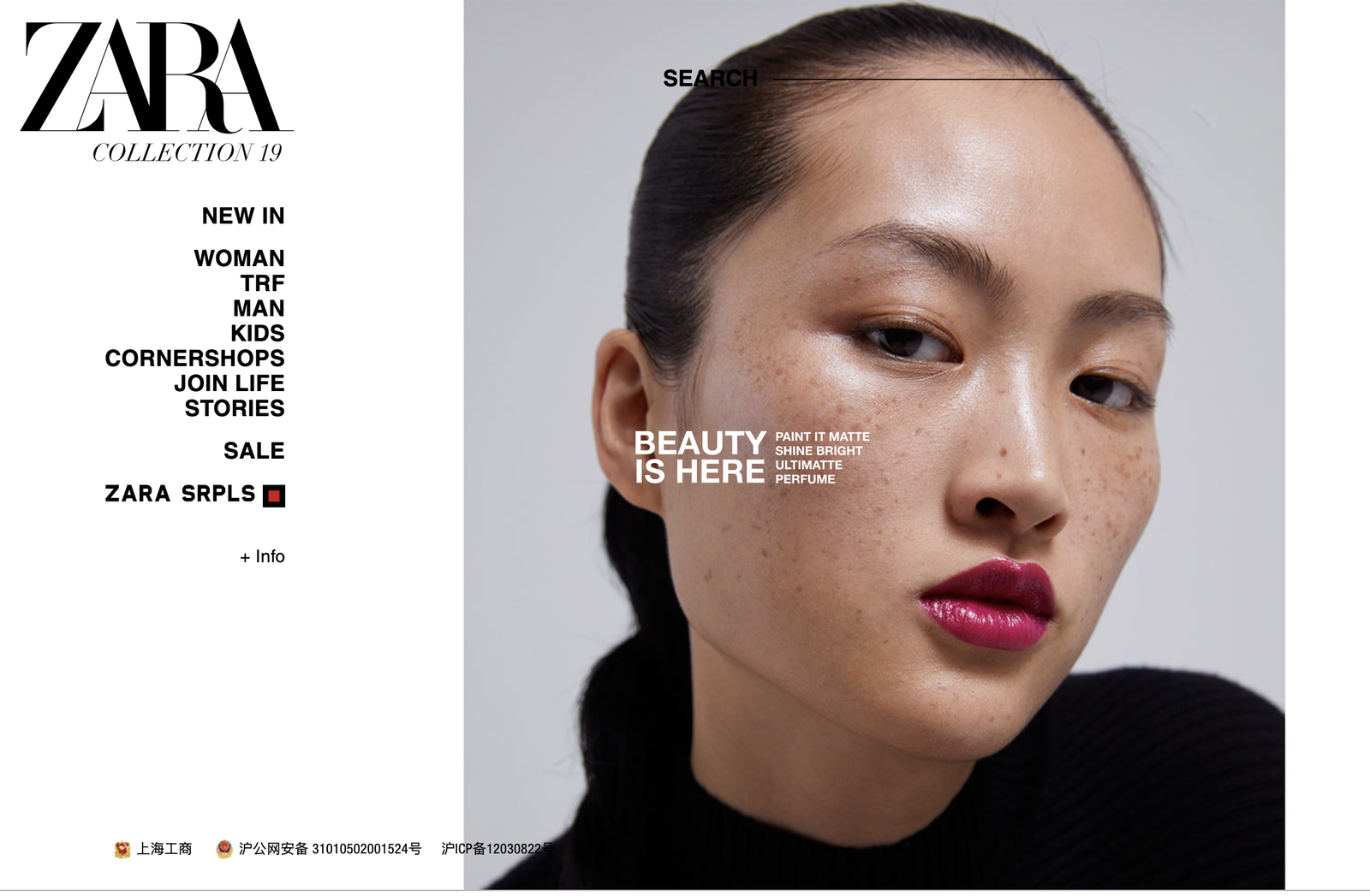 The image itself depicts the home screen of a Zara webpage advertising their beauty products. On the left is their usual set-up of the shopping categories as well as their logo. On the right two thirds is a close up portrait of Jing Wen. Her face is angled to the right and her expression is quite monotone, with her eyes gazing towards the camera. The background is empty, her hair has been slicked back from her face and her clothing is black which ensures that the viewers eyes are drawn to her face, in particular the dark pink lipstick that they are advertising and also -perhaps unintentionally- her freckles. As her freckles are so visible, it gives the campaign a ‘natural’, unedited and fresh feel. Situated on top of her cheek are the large words “Beauty is here”, accompanied by some smaller type that reads “paint it matte, shine bright, ultimate, perfume”, making it obvious that the photo is an accompaniment to their advertising of beauty products. (fig.1)