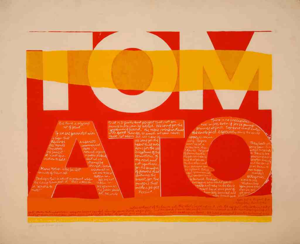 As for the print, it shows the text ‘tomato’ in bold, made in like an advertisement or logo. The colors are shown in orange, red and yellow which are analogous colors. Despite you see in a distance, it quite obvious to recognize the word “TOMATO”. Once you have drawn in, you could see a message in the footnote that indicated “Mary Mother is the Juiciest Tomato of All” which is an advertising jingle for Del Monte tomato sauce. Kent had used her humor way to present for imagining Mary as a huge juiciest tomato. I think Kent really simply use a powerful text to demonstrate her thought and when people see it will transfer to an image of the political message. Due to Kent was a Catholic nun and had a strong connection with religious culture, under the influence of her environment, “She was inspired by the efforts of the Vatican Council II in 1962 to modernize Catholic liturgy by incorporating vernacular language in the church.”[3] She took the view of church to modernize to the Virgin Mother Mary use the innovative way by looking at the every-day object and give a new meaning to it. Furthermore, it seems Kent made the concerns of Vatican II turns into a contemporary society to catch people’s attention. As Malpass indicated that, “its intention is to engage the audiences imagination and intellect to convey message”[4] Kent emphasis her role and opinions to let audiences raise their awareness. The work also represents divine not only exist in church or religion culture but relevant in people daily life. Kant recovered the spiritual in another language to promote that goal which is demonstrated that the kindness and generosity of Mother Mary and Christ can also be found in a modern day.[5]