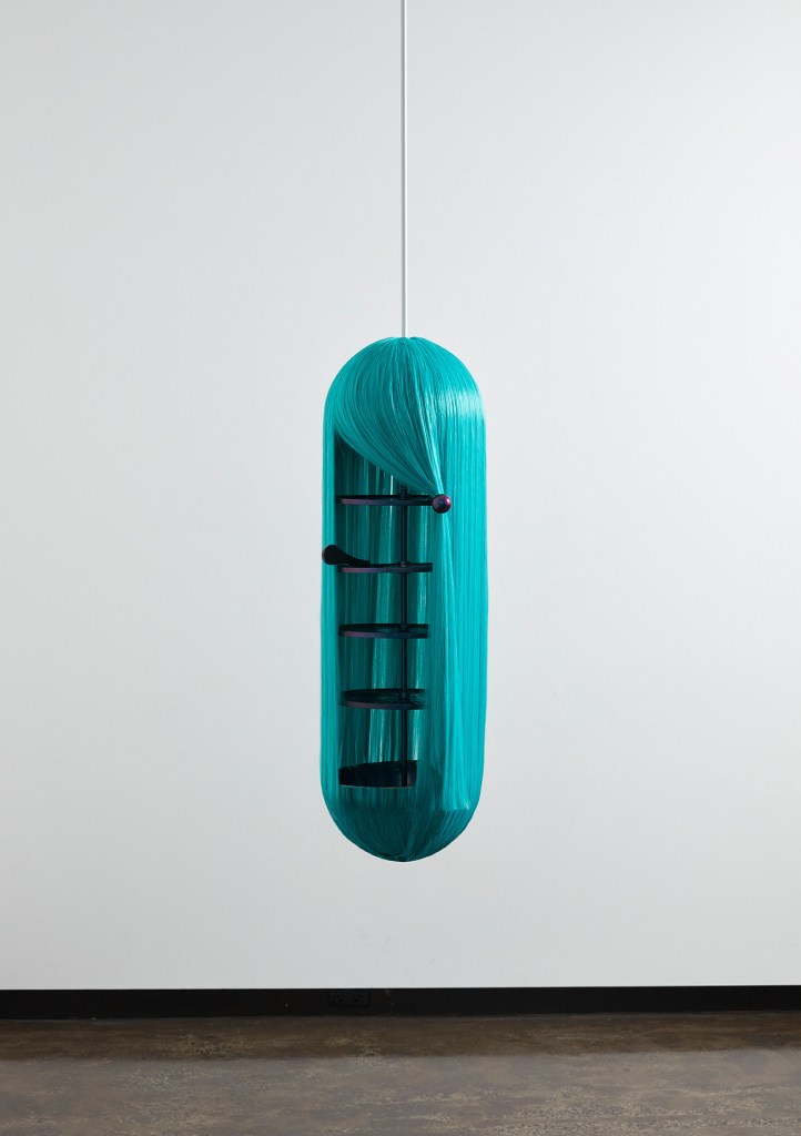 One of the works included in designing women exhibition is Weaver(Fig.1) which is designed by Elliat Rich. When I first saw Weaver, I still could not recognize what is it but think as abstract art. The first impression is about the hair with extremely catching-eye light green color, I think there is a connection between women aesthetic and the sculpture. Rich said that “Weaver is a cylindrical shelf suspended from the ceiling that is covered in a curtain of turquoise synthetic fibre-the kind which is used in wigs. There are four shelves inside are coated in pearlescent chameleon paint that glitters, becoming iridescent as the light falls on it.”[2] The curtain hair and the synthetic material are so powerful and attractive. “Its magnetic qualities are strengthened by the practical utility of the piece.”[3] It also looks like a girl with the curtain hair being attached behind a metallic ‘ear’.[4] I feel like as Rich said that the gesture of pulling the hair behind the metallic ear is quite intimate and it is like an existing person that have personality and emotion of it. Also, we almost like having a relationship talking to each other.
